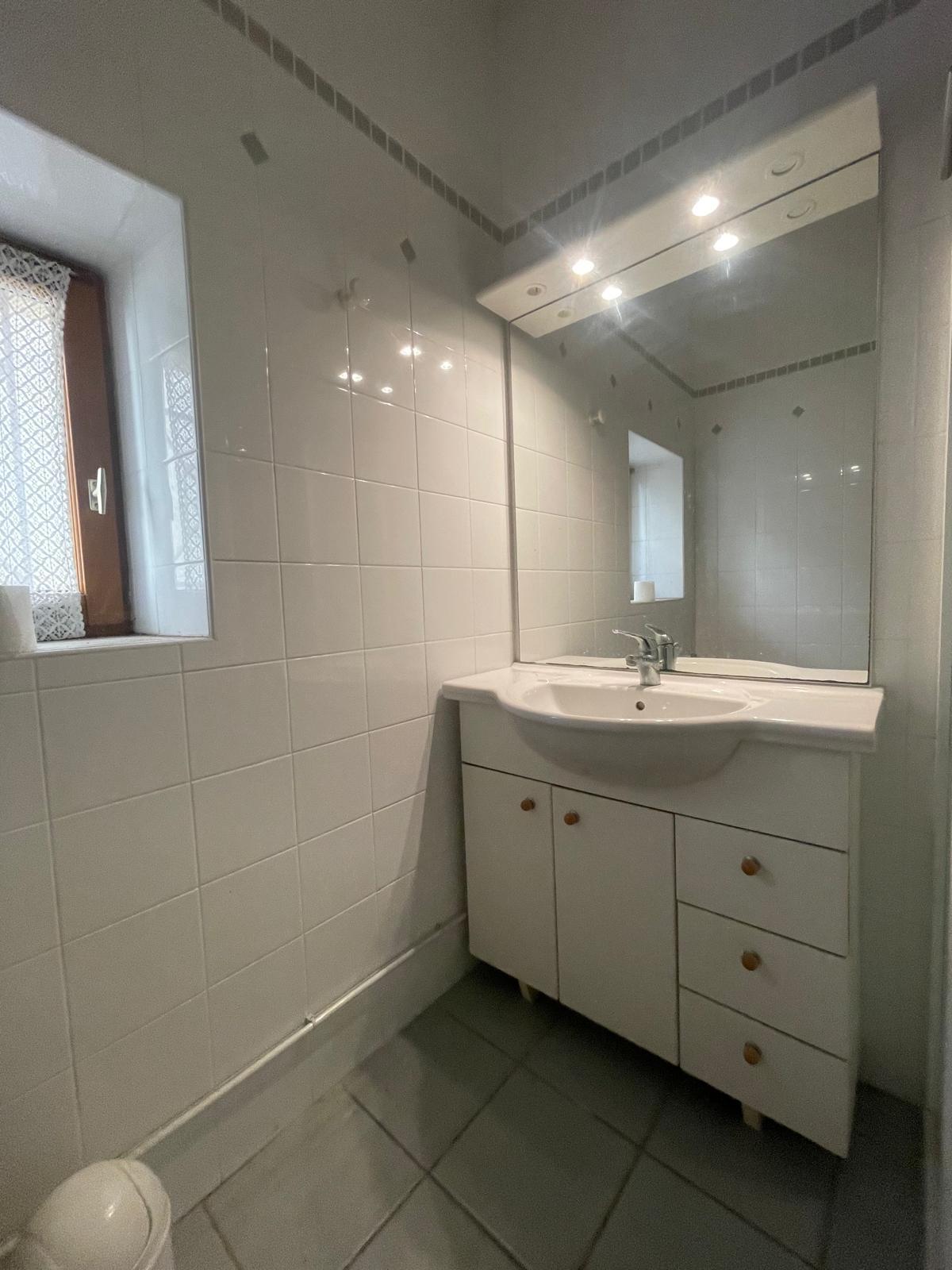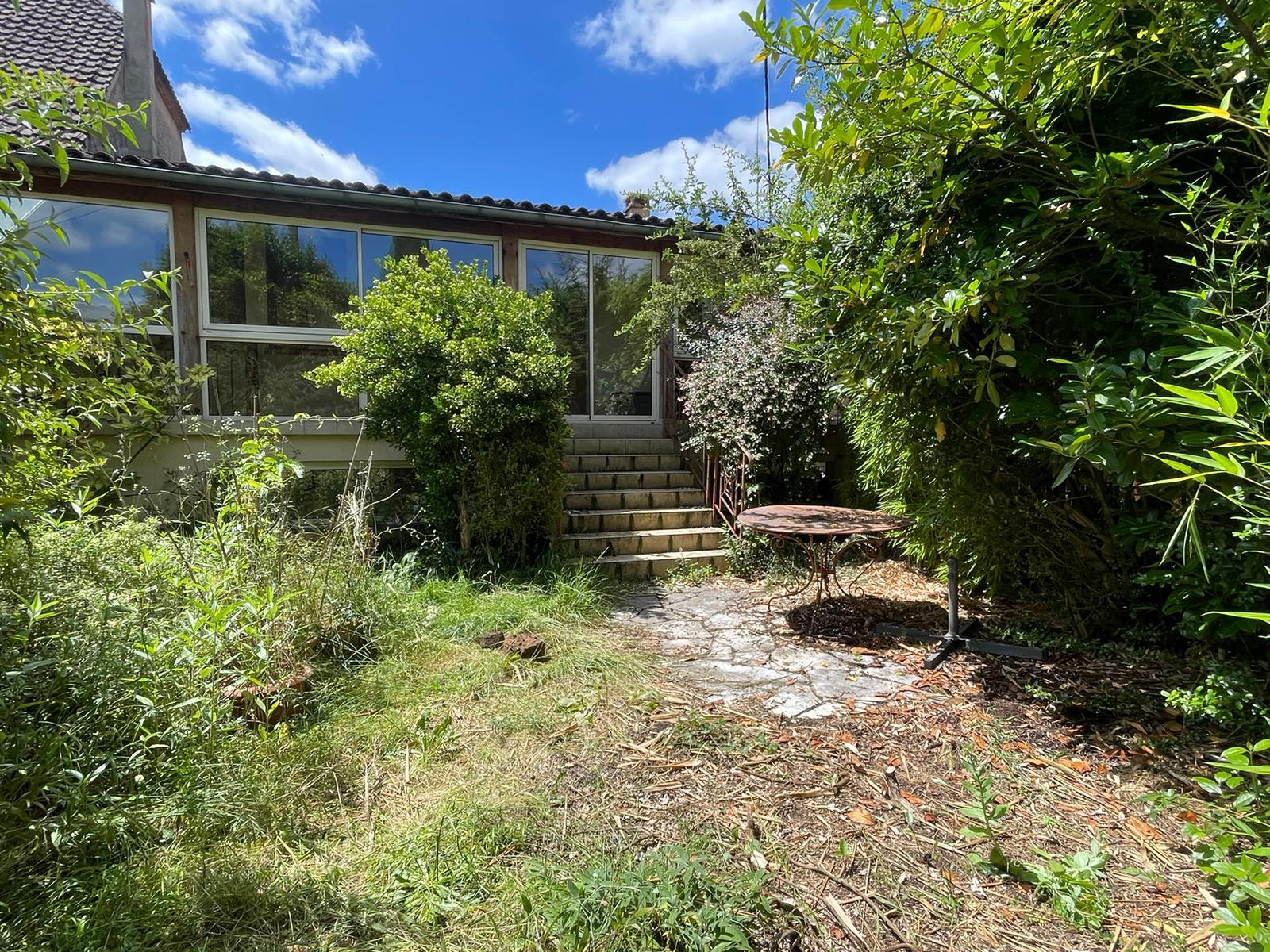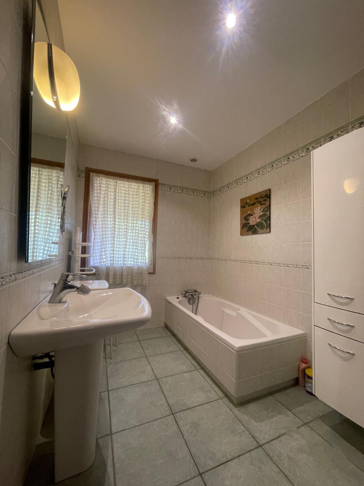 À l’étage : balcon/véranda (avec accès au jardin), entrée principale, cuisine indépendante, salon/salle à manger avec cheminée (insert) et sortie sur balcon de 3m2, 2 chambres doubles, 1 salle de bain (baignoire) avec WC séparé, débarras.