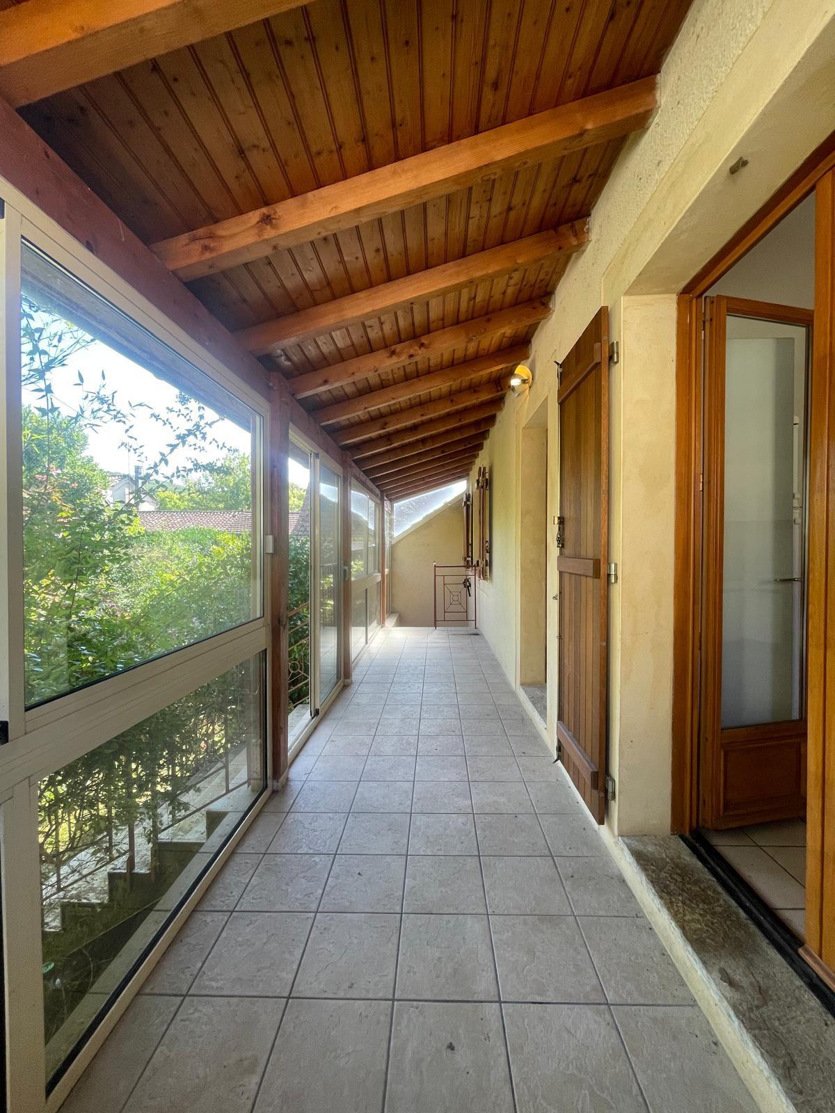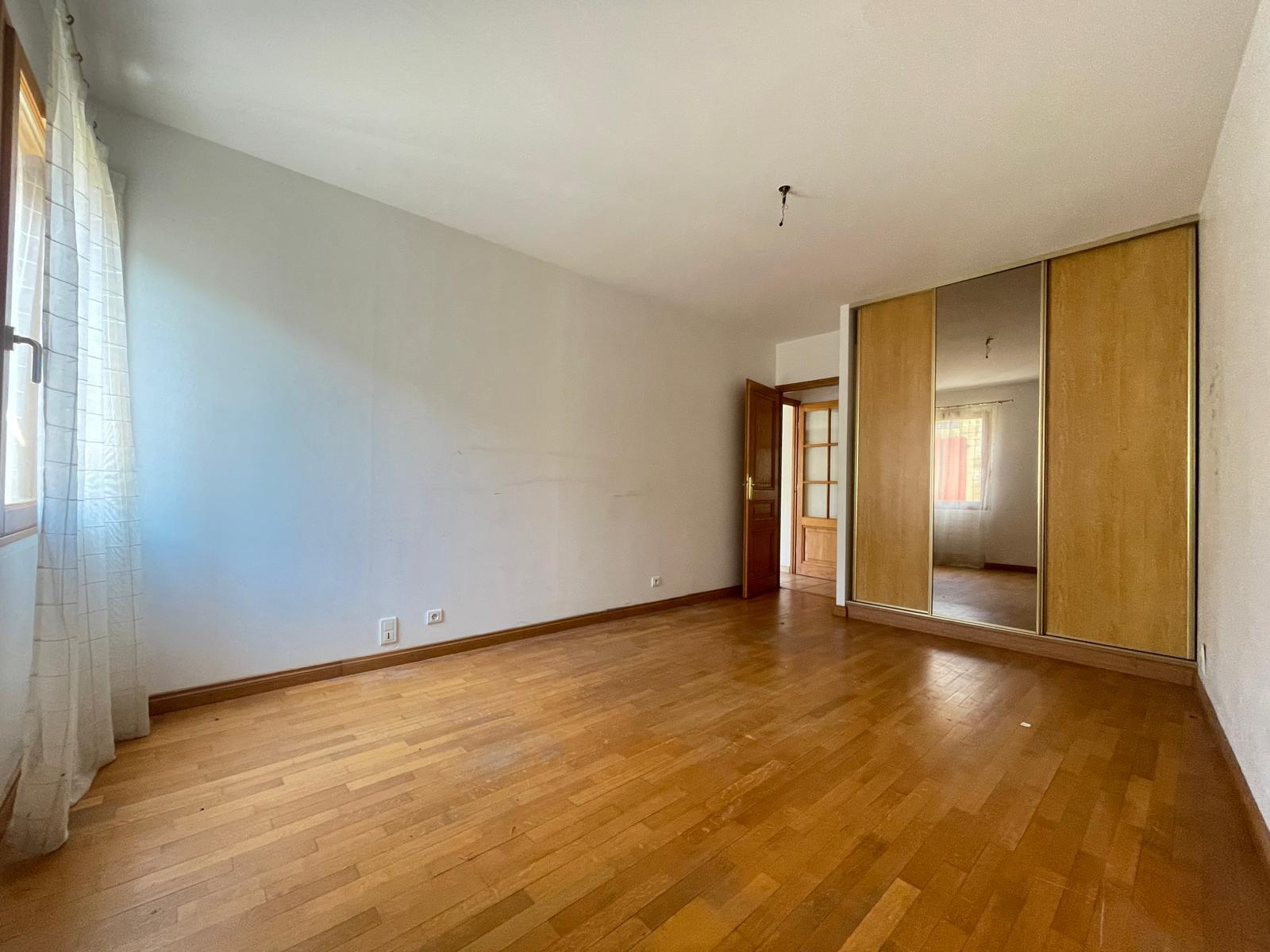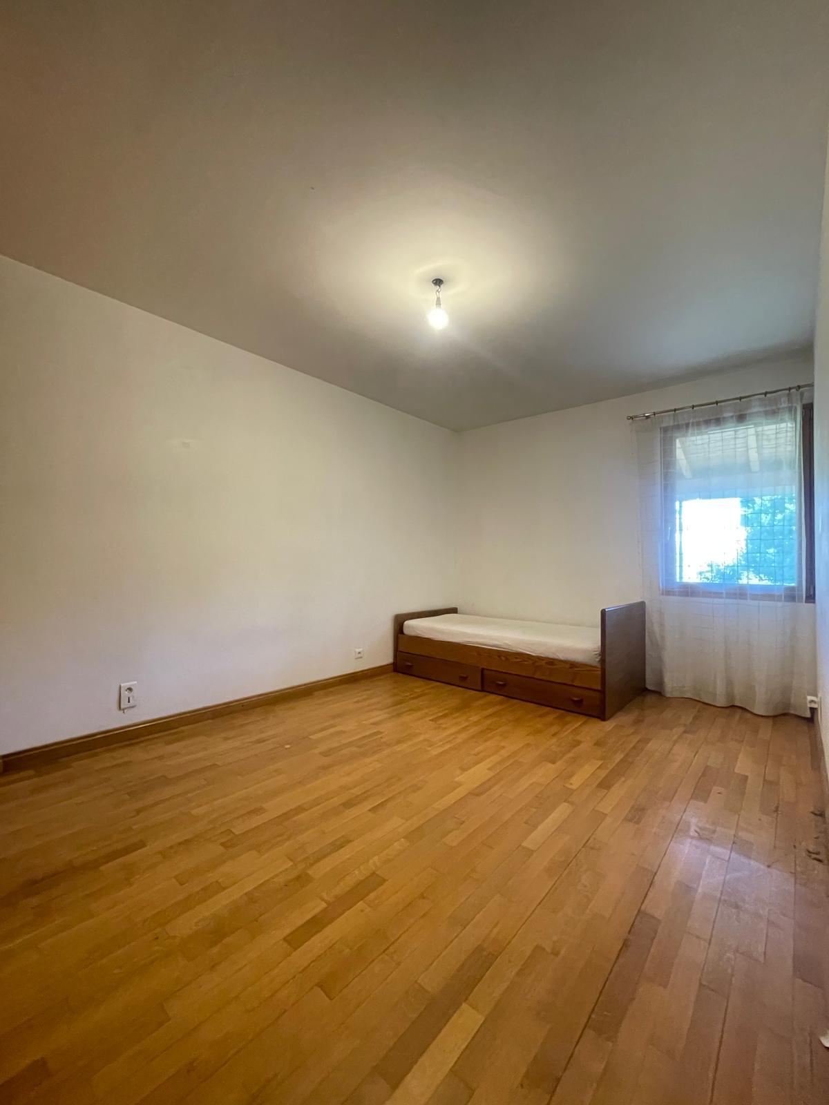 À l’étage : balcon/véranda (avec accès au jardin), entrée principale, cuisine indépendante, salon/salle à manger avec cheminée (insert) et sortie sur balcon de 3m2, 2 chambres doubles, 1 salle de bain (baignoire) avec WC séparé, débarras.